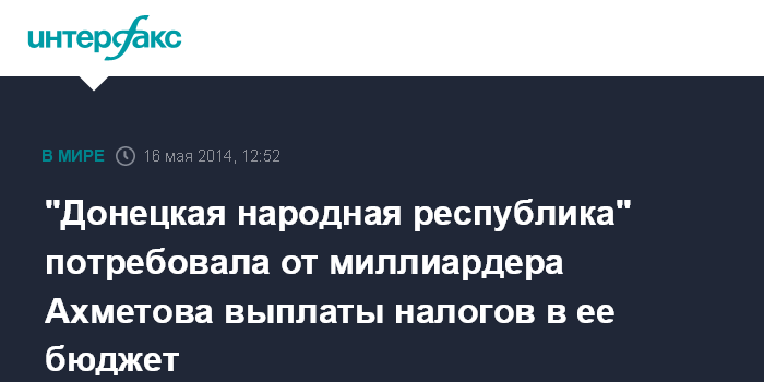 Москва. 16 мая. INTERFAX.RU - Правительство "Донецкой народной республики" предложило украинскому миллиардеру Ринату Ахметову платить налоги в бюджет нового государственного образования.