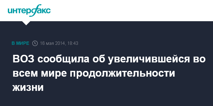 Москва. 16 мая. INTERFAX.RU - Во всем мире увеличилась продолжительность жизни, следует из доклада Всемирной организации здравоохранения.