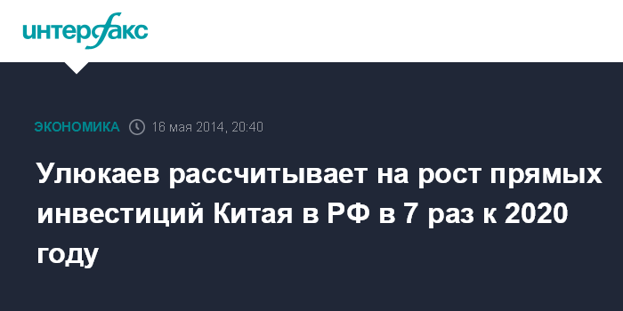 Москва. 16 мая. INTERFAX.RU - Министр экономического развития РФ Алексей Улюкаев рассчитывает на рост прямых инвестиций Китая в Россию к 2020 году в 7 раз. Как сообщила пресс-служба министерства, в пятницу Улюкаев в Циндао (Китай) провел переговоры с министром коммерции КНР Гао Хучэном в рамках открывшейся встречи министров торговли форума АТЭС.