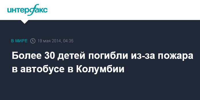 Москва. 19 мая. INTERFAX.RU - По меньшей мере 30 человек стали жертвами пожара в автобусе на севере Колумбии, большинство из них - дети, спастись удалось 18 пассажирам, в том числе нескольким взрослым, передает BBC.