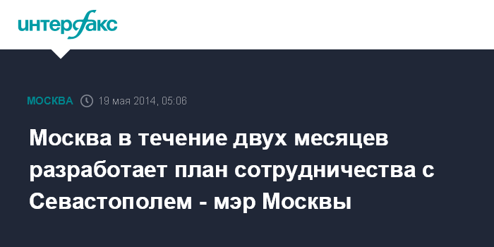 Москва. 19 мая. INTERFAX.RU - В течение двух месяцев власти Москвы разработают план сотрудничества с Севастополем на ближайшую перспективу, об этом сообщил мэр Москвы Сергей Собянин.