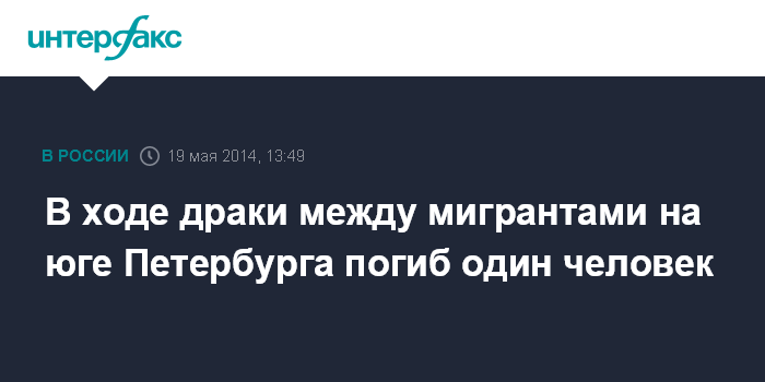 Москва. 19 мая. INTERFAX.RU - Один человек погиб в ходе драки между мигрантами в ночь на понедельник в Кировском районе Петербурга, сообщает пресс-служба регионального ГУМВД.