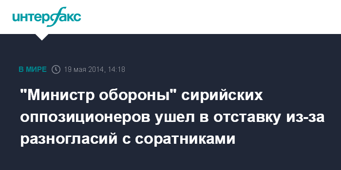Москва. 19 мая. INTERFAX.RU - Глава учрежденного Национальной коалицией сирийских революционных и оппозиционных сил (НКСРОС) "министерства обороны" Асаад Мустафа сложил с себя полномочия из-за разногласий с соратниками, сообщает ливанская газета Daily Star.