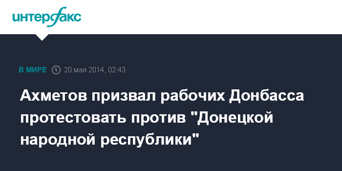 Москва. 20 мая. INTERFAX.RU - Украинский бизнесмен Ринат Ахметов, владеющий крупнейшей в стране финансово-промышленной группой "Систем Кэпитал Менеджмент" (СКМ) призвал все трудовые коллективы Донбасса выйти во вторник днем на акцию протеста против так называемой "Донецкой народной республики". Соответствующее обращение размещено в понедельник вечером.