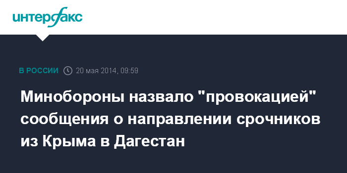 Москва. 20 мая. INTERFAX.RU - Минобороны РФ категорически опровергло информацию газеты "Новые известия" о направлении вопреки военнослужащих-срочников из Крыма для прохождения службы в Дагестане.