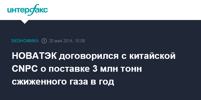 Москва. 20 мая. INTERFAX.RU - Производитель газа ОАО "НОВАТЭК" подписал контракт с китайской национальной нефтегазовой корпорацией CNPC на поставку 3 млн тонн сжиженного природного газа в год, передал корреспондент с церемонии подписания.