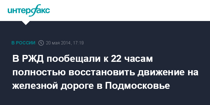 Москва. 20 мая. INTERFAX.RU - Движение на месте железнодорожной катастрофы в Подмосковье будет полностью восстановлено к 22 часам вторника.