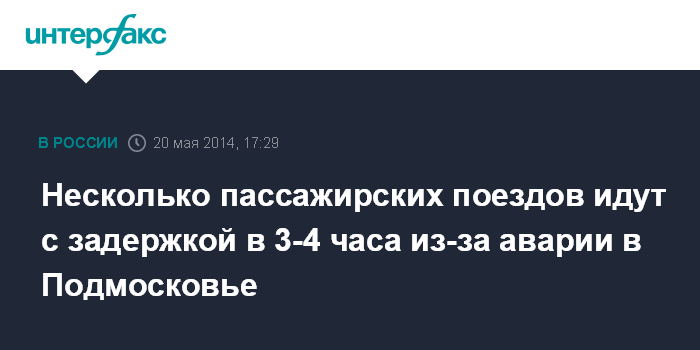 Москва. 20 мая. INTERFAX.RU - Несколько пассажирских поездов дальнего следования из-за аварии в Подмосковье идут с задержкой в 3-4 часа, сообщил представитель РЖД на селекторном совещании в МЧС России.