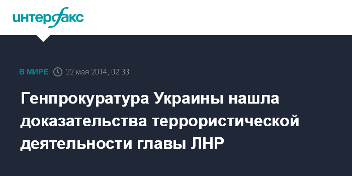 Москва. 22 мая. INTERFAX.RU - Генпрокуратура Украины собрала достаточно доказательств, чтобы квалифицировать деятельность главы самопровозглашенной Луганской народной республики Валерия Болотова как создание террористической организации, сообщила пресс-служба ведомства в среду.