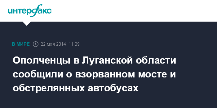 Москва. 22 мая. INTERFAX.RU - На севере Луганской Народной Республики, которая контролируется Национальной гвардией Киева, начались вооруженные столкновения, в ходе которых был взорван мост через реку Северский Донец и обстреляны автобусы и мирное население, заявили "Интерфаксу" в штабе Объединенной Армии Юго-востока в четверг.