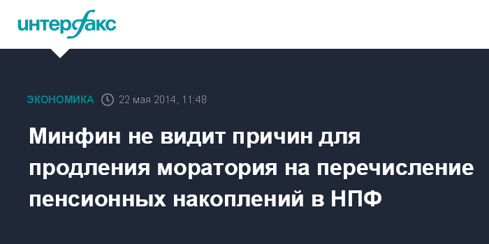 Москва. 22 мая. INTERFAX.RU - Минфин РФ ничего не знает об идее продления моратория на передачу пенсионных накоплений из Пенсионного фонда России (ПФР) в негосударственные пенсионные фонды (НПФ) и не видит никаких причин для такого продления, сообщил журналистам замминистра финансов РФ Алексей Моисеев.