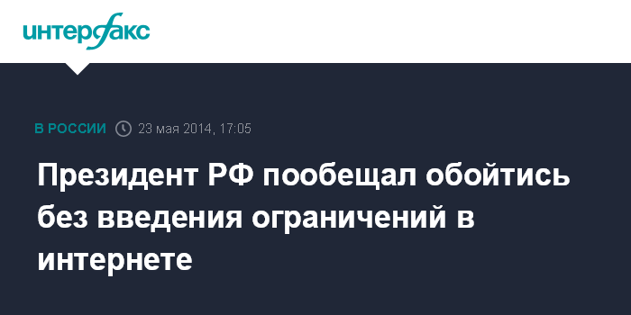 Москва. 23 мая. INTERFAX.RU - Президент Владимир Путин заявил, что в России нет и не планируется вводить ограничения, связанные с использованием интернета, это касается только пропаганды суицидов и педофилии.