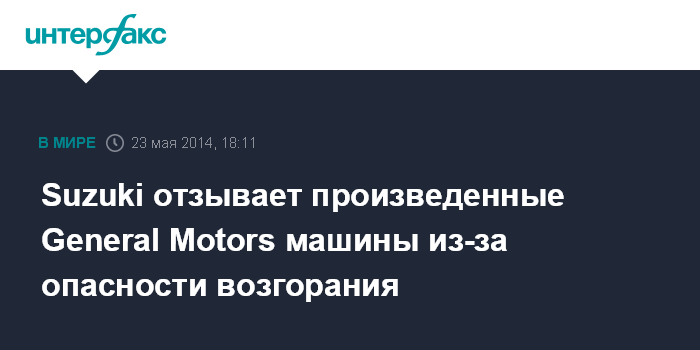 Москва. 23 мая. INTERFAX.RU - Suzuki Motor Corp. объявила об отзыве более 184 тыс. малолитражных автомобилей, произведенных в США на заводах General Motors, в связи с опасностью возгорания рулевых колонок, сообщает Associated Press.