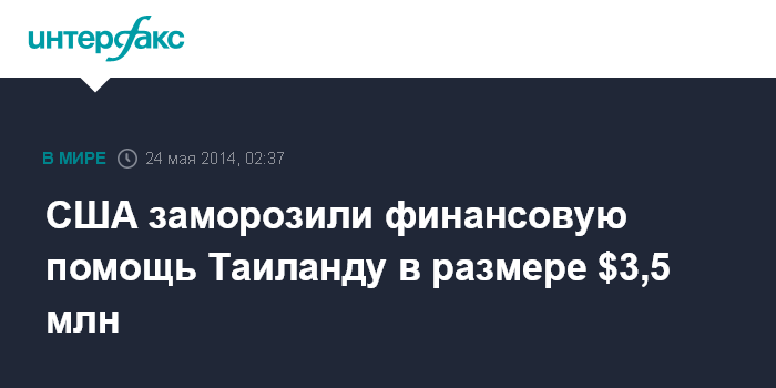 Москва. 24 мая. INTERFAX.RU - США приостановили выделение транша военной помощи Таиланду в размере $3,5 млн в ответ на военный переворот в стране, сообщили AP в государственном департаменте США в пятницу.