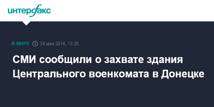 Москва. 24 мая. INTERFAX.RU - Вооруженные активисты самопровозглашенной "Донецкой народной республики" (ДНР) захватили здание Центрального городского объединенного военкомата в Донецке вечером 23 мая, сообщает в субботу издание "Новости Донбасса". "Около 50 человек с оружием, одетые в камуфляжную форму, окружили здание военного комиссариата. Данный факт внесен в Единый реестр досудебных расследований по ст. 341 УК Украины (захват государственных или общественных зданий или сооружений)", - говорится в сообщении.