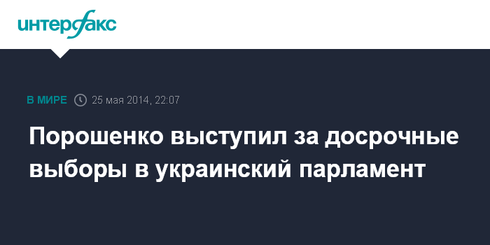 Москва. 25 мая. INTERFAX.RU - Лидер президентской гонки на Украине Петр Порошенко выступил за проведение в 2014 году досрочных выборов в Верховную Раду. С таким заявлением кандидат в президенты выступил в воскресенье на брифинге в своем штабе.