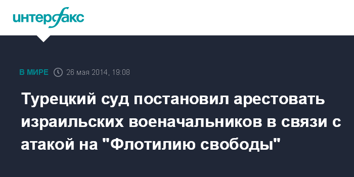 Москва. 26 мая. INTERFAX.RU - Суд Стамбула постановил в понедельник арестовать четырех высокопоставленных израильских военачальников, участвовавших в атаке на "Флотилию свободы", сообщает газета Hurriyet.
