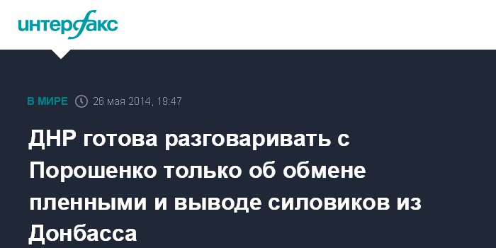 Москва. 26 мая. INTERFAX.RU - Диалог Донецкой народной республики (ДНР) с Петром Порошенко, который, по предварительным данным, победил на президентских выборах Украины, возможен по вопросам обмена заложниками и вывода украинских войск с территории ДНР, заявил глава президиума верховного совета ДНР Денис Пушилин.