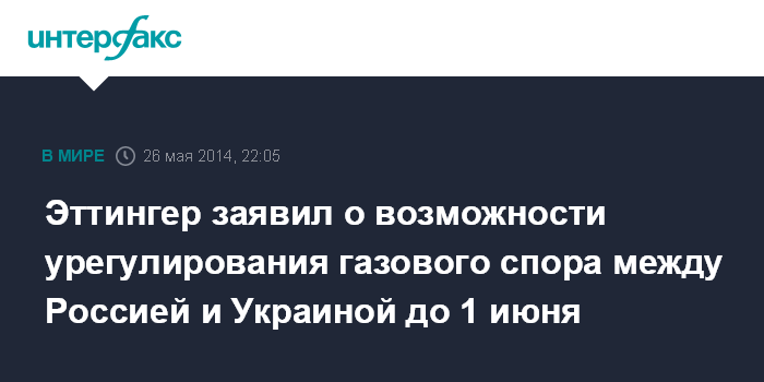 Москва. 26 мая. INTERFAX.RU - Представители России и Украины имеют хорошие шансы на то, чтобы до 1 июня урегулировать спор по поводу поставок газа, связанный с тем, что представители украинского "Нафтогаза" считают назначенную Россией цену завышенной. Об этом заявил в понедельник член Еврокомиссии Гюнтер Эттингер, курирующий вопросы энергетики.