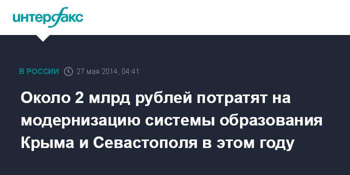 Москва. 27 мая. INTERFAX.RU - Правительство поручило Минфину выделить 2 млрд рублей Министерству образования и науки на модернизацию системы образования Республики Крым и города Севастополя, сообщает газета "Известия" во вторник.