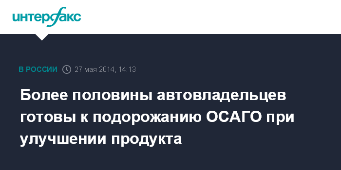 Москва. 27 мая. INTERFAX.RU - Более половины автомобилистов (56%) готовы к увеличению на 25% взносов обязательного страхования ответственности владельцев транспортных средств (ОСАГО) при условии внесения определенных изменений в продукт, сказал руководитель отдела по работе с органами государственной власти ВЦИОМ Кирилл Родин на пресс-конференции в центральном офисе "Интерфакса" во вторник.