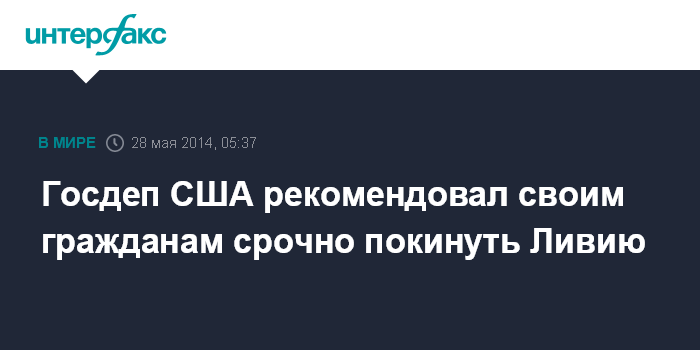 Москва. 28 мая. INTERFAX.RU - Госдепартамент США распространил уведомление, в котором рекомендует американским гражданам воздерживаться от проездок в Ливию, а находящимся там - незамедлительно покинуть страну.