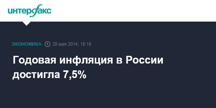 Москва. 28 мая. INTERFAX.RU - Инфляция в России за неделю с 20 по 26 мая составила 0,3%, сообщил в среду Росстат. Исходя из данных Росстата, в годовом выражении инфляция на 26 мая достигла 7,5% (неделю назад - 7,4%), сравнявшись с ключевой ставкой ЦБ РФ.
