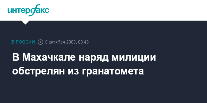 Москва. 8 октября. INTERFAX.RU - Наряд патрульно-постовой службы милиции был обстрелян минувшей ночью в Махачкале. Как сообщили "Интерфаксу" в пресс-службе УВД города, инцидент произошел около 00:50 мск на перекресте улиц Шамиля и Магомеда Ярагского. "Машина ППС, остановившаяся около гостиницы "Спорт", была обстреляна из гранатомета Муха". В результате обстрела пострадавших нет, стрелявший не попал по машине", - сообщили в пресс-службе УВД.