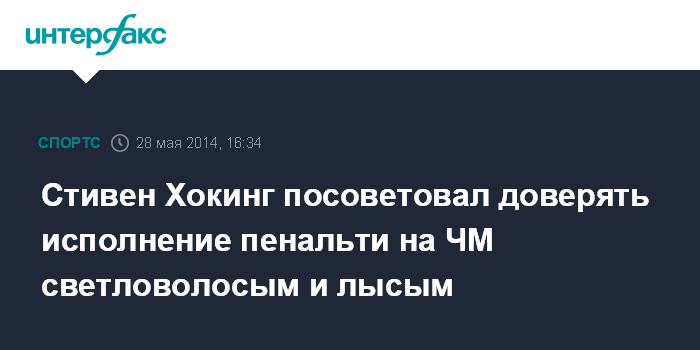 Москва. 28 мая. INTERFAX.RU - Знаменитый физик Стивен Хокинг подсчитал, что лысые и светловолосые футболисты исполняют пенальти на чемпионатах мира точнее, чем темноволосые игроки. По просьбе букмекерской конторы Paddy Power он проанализировал все одиннадцатиметровые удары, которые исполнялись на Мундиалях, начиная с их внедрения в 1978 году, и выявил несколько закономерностей. В преддверии чемпионата мира в Бразилии английский ученый опубликовал свои выводы в блоге Paddy Power.