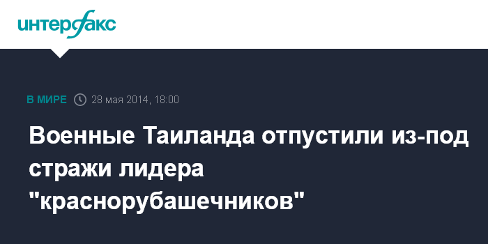 Москва. 28 мая. INTERFAX.RU - Военное руководство Таиланда в среду освободило из-под стражи лидера поддерживающего движения "краснорубашечников" Хатупона Промпана, а также четырех его единомышленников, передает агентство Associated Press.