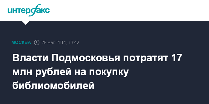 Москва. 29 мая. INTERFAX.RU - Власти Подмосковья выделят около 17 млн рублей на закупку трех библиомобилей в 2014 году. Об этом сообщила пресс-служба советника губернатора Московской области, курирующего направления культуры, спорта, туризма и молодежной политики, Игоря Чайки.