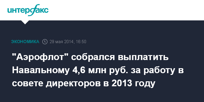 Москва. 29 мая. INTERFAX.RU - "Аэрофлот" может выплатить бывшему члену совета директоров компании Алексею Навальному 4,6 млн рублей, говорится в материалах к собранию акционеров авиаперевозчика, на котором будет рассмотрен и вопрос о вознаграждении членов совета.