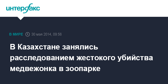 Москва. 30 мая. INTERFAX.RU - В Казахстане полиция начала расследование в связи с инцидентом в зоопарке Караганды (адмцентр Карагандинской области), где медвежонка скормили ягуарам на глазах детей.
