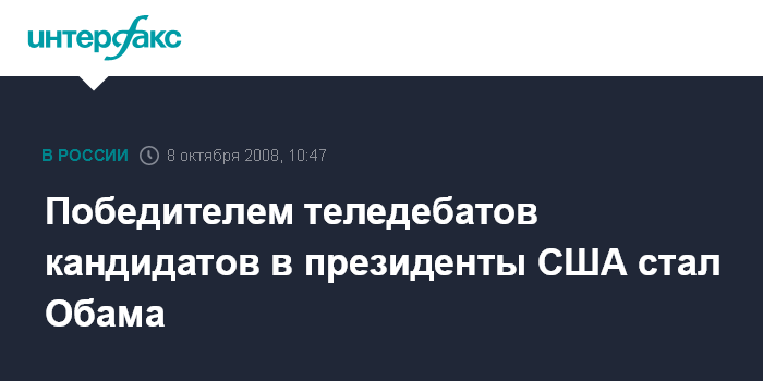 Москва. 8 октября. INTERFAX.RU - Вторые дебаты кандидатов в президенты США выиграл демократ Барак Обама. Такие данные привел в среду американский телеканал Си-Би-Эс по итогам опроса 400 избирателей, не высказывающих явных симпатий к какому-либо конкретному кандидату. Опрос был проведен сразу по окончании теледебатов.