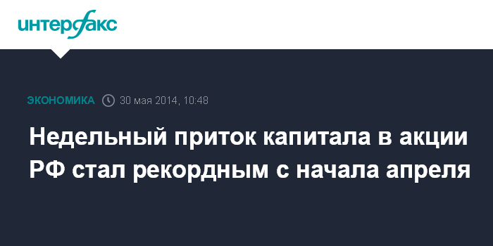 Москва. 30 мая. INTERFAX.RU - Приток капитала в фонды, ориентированные на акции РФ, с 22 по 28 мая 2014 года стал рекордным с начала апреля и составил $104 млн, по данным Emerging Portfolio Fund Research (EPFR).