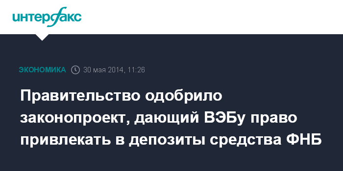 Москва. 30 мая. INTERFAX.RU - Правительство России одобрило поправки в Бюджетный кодекс, предусматривающие возможность размещения на депозитах Внешэкономбанка до 7% средств Фонда национального благосостояния (ФНБ), говорится на сайте кабмина.