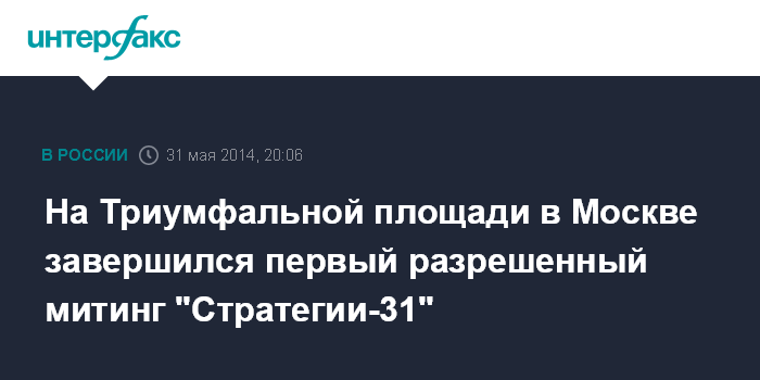 Москва. 31 мая. INTERFAX.RU - Первый разрешенный митинг "Стратегии-31" на Триумфальной площади завершился, передает корреспондент "Интерфакса". Оппозиционная акция, впервые согласованная московскими властями на Триумфальной площади, продлилась чуть менее полутора часов. При этом оппозиционеры имели возможность митинговать с 18:00 до 20:00.