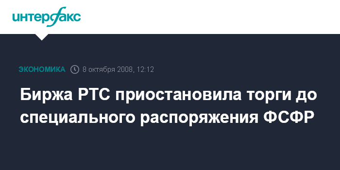Москва. 8 октября. INTERFAX.RU - РТС приостановила торги до специального распоряжения ФСФР, сообщили агентству "Интерфакс-АФИ" на бирже.