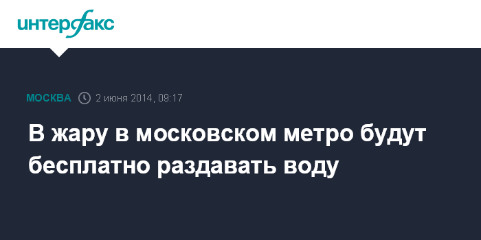Москва. 2 июня. INTERFAX.RU - Когда температура на платформах метрополитена будет превышать 28 градусов, в московском метро будут бесплатно раздавать питьевую воду, сообщает пресс-служба столичной подземки. Раздача бесплатной воды будет организована через специальные автоматы.
