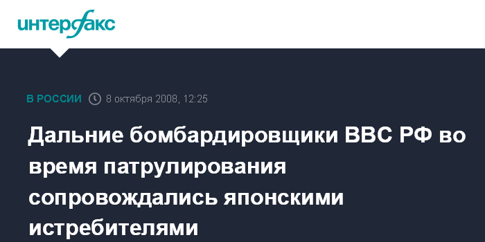 Москва. 8 октября. INTERFAX.RU - Два дальних бомбардировщика Ту-22М3 во время полетов на воздушное патрулирование в акватории Японского моря сопровождались истребителями военно-воздушных сил Японии, сообщил "Интерфаксу-АВН" помощник главкома ВВС РФ подполковник Владимир Дрик.
