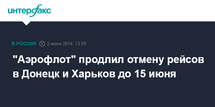 Москва. 2 июня. INTERFAX.RU - Российская авиакомпания "Аэрофлот" продлила отмену рейсов в Донецк и Харьков до 15 июня, сообщил "Интерфаксу" источник в авиаперевозчике.