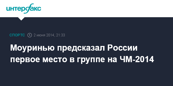 Москва. 2 июня. INTERFAX.RU - Главный тренер лондонского футбольного клуба "Челси" Жозе Моуринью считает, что Россия с первого места выйдет в плей-офф чемпионата мира-2014 в Бразилии и в 1/8 финала встретится с Португалией.