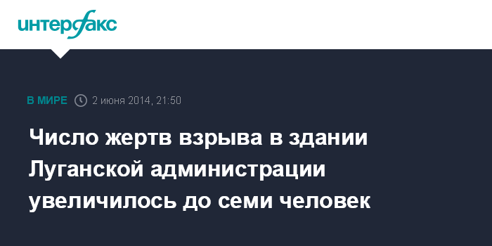 Москва. 2 июня. INTERFAX.RU - В результате взрыва в Луганской областной государственной администрации погибли семь человек, сообщает интернет-издание CXID.info со ссылкой на директора департамента здравоохранения Луганской ОГА Павла Малыша.