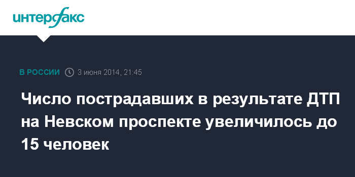Москва. 3 июня. INTERFAX.RU - В результате ДТП на Невском проспекте в Петербурге пострадали 15 человек, сообщили во вторник "Интерфаксу" в ГУ МВД по северной столице.