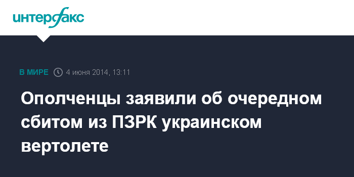 Москва. 4 июня. INTERFAX.RU - Вертолет украинской армии был сбит ополченцами Славянска из переносной зенитно-ракетной установки, сообщили корреспонденту "Интерфакса" в местном штабе.