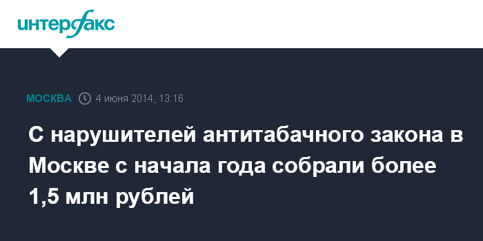 Москва. 4 июня. INTERFAX.RU - За нарушение "антитабачного" закона в Москве с начала года взыскано 1 634 000 рублей, сообщило в среду столичное управление Роспотребнадзора. Всего к административной ответственности было привлечено 60 должностных и юридических лиц.