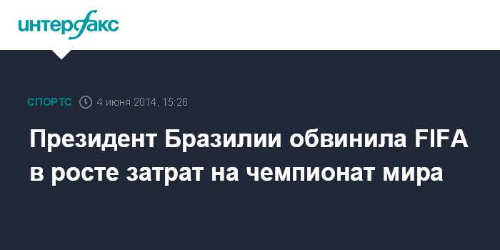 Москва. 4 июня. INTERFAX.RU - Президент Бразилии Дилма Руссефф считает, что ее страна разумно тратит деньги при подготовке к чемпионату мира по футболу, а в возросшей для хозяев Мундиаля стоимости турнира виновата FIFA, сообщает The Citizen.