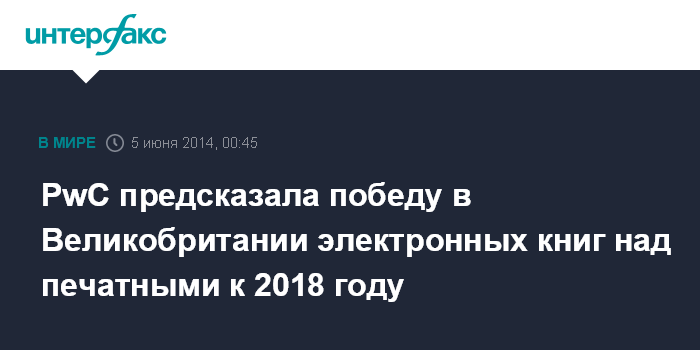 Москва. 4 июня. INTERFAX.RU - Продажи электронных книг превысят продажи печатных в Великобритании уже в 2018 году, следует из доклада Pricewaterhouse Coopers.
