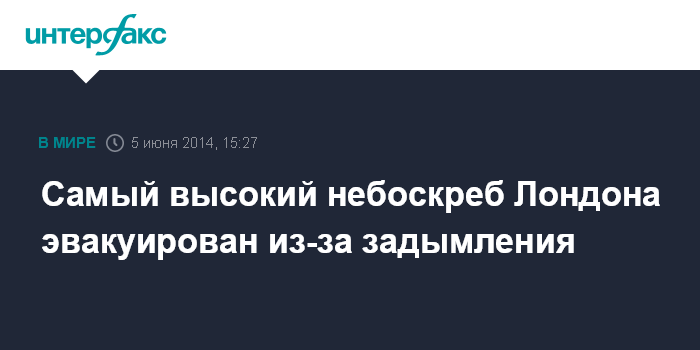 Москва. 5 июня. INTERFAX.RU - В самом высоком здании в Лондоне - башне The Shard - проведена эвакуация из-за задымления, пишет в четверг газета Independent.