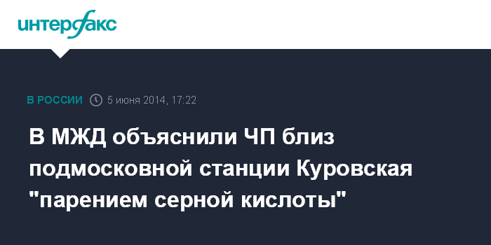Москва. 5 июня. INTERFAX.RU - Московская железная дорога прокомментировала инцидент близ станции Куровская в Подмосковье, пояснив, что разлива серной кислоты не было, а происходило ее парение.